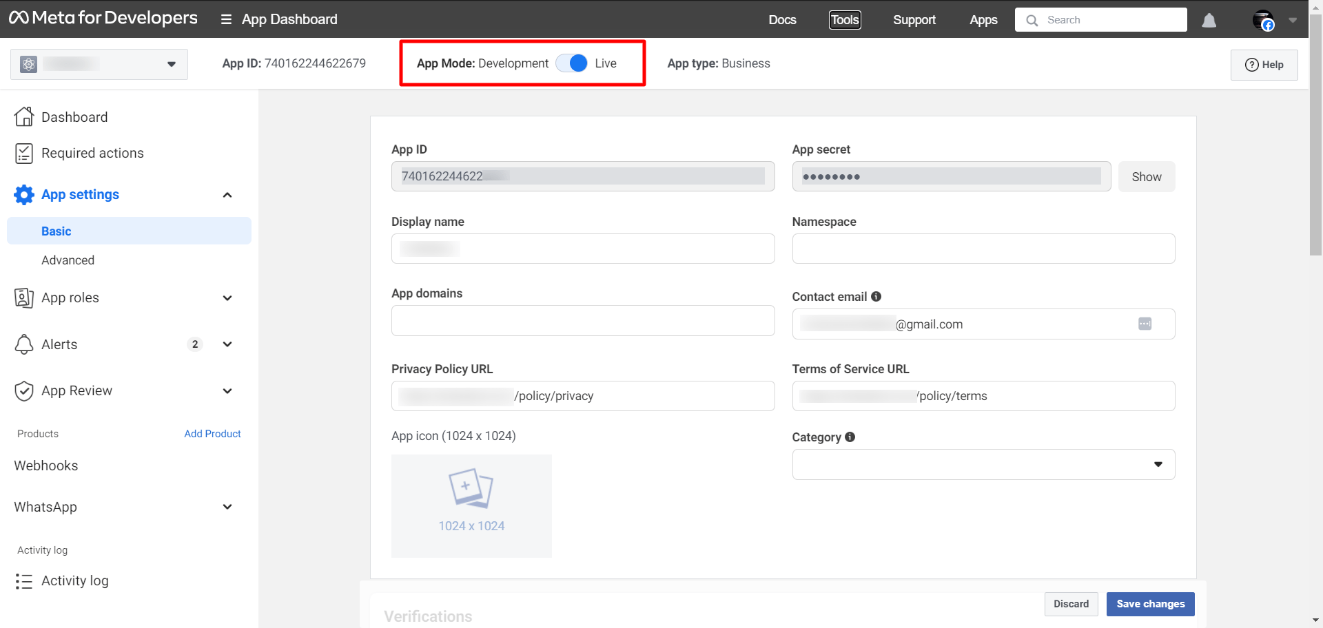 Then from the App settings, click on the Basic option and add the Privacy Policy URL and Terms of Service URL from the Wooza App. These URLs are available on the Connect bot page of Wooza App. After adding these URLs just click on the “Save changes” button.