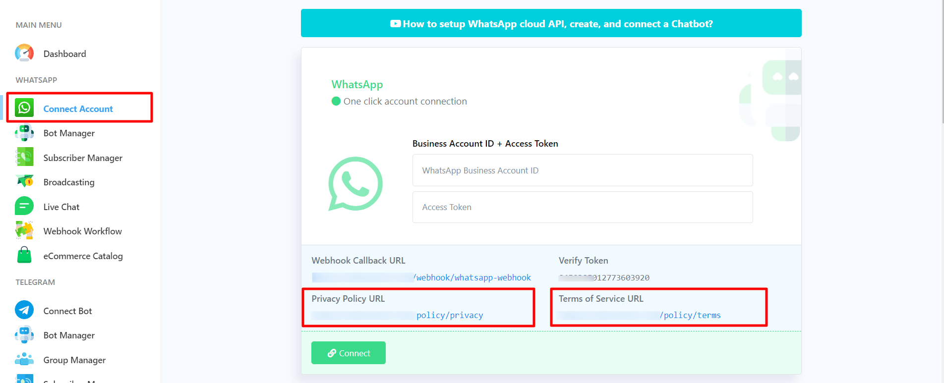To get the callback URL and verify the token from Wooza App. Login to your account and go to the dashboard of Wooza App. At the left sidebar of the Dashboard, under the WhatsApp section, you will see connect WhatsApp option. Now click on the connect WhatsApp menu and instantly, Connect WhatsApp Business page will appear.